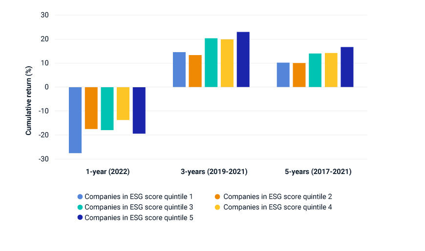 - Level of ESG rating: higher/lower ESG ratings can be accompanied by higher or lower annual returns, reflecting the idea that (1) higher sustainability goes hand in hand with higher cost and therefore lower performance or (2) the idea that higher ESG ratings reflect a more stable company that is better adapted to future challenges.