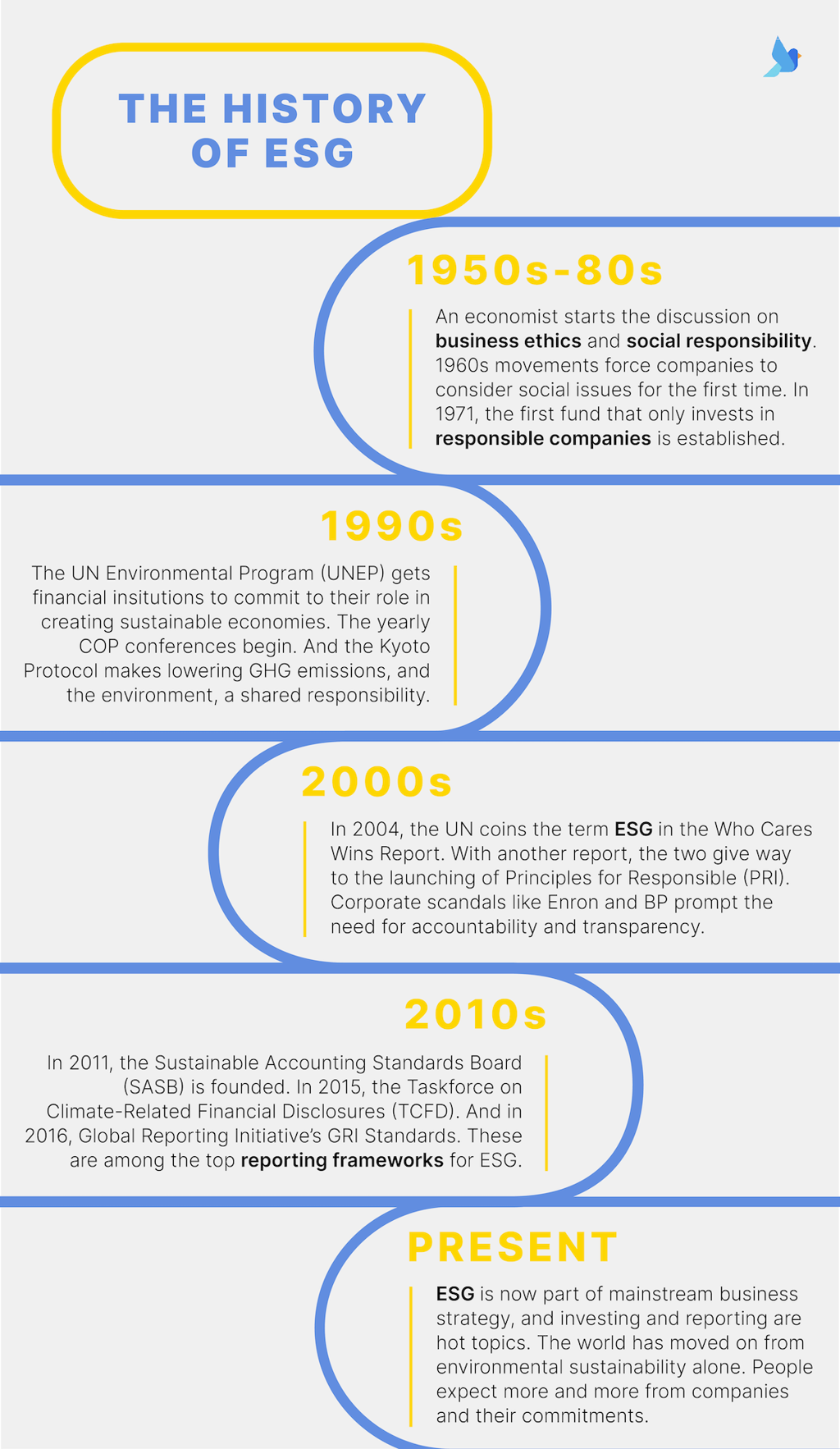 In the late 1980s and early 1990s, the first tools to help investors assess a company’s environmental impact and social governance began to emerge. 1990 marked a significant milestone with the launch of the Domini 400 Social Index (now the MSCI KLD 400 Social Index), one of the first indices intended to help investors benchmark the performance of companies with superior ESG ratings.