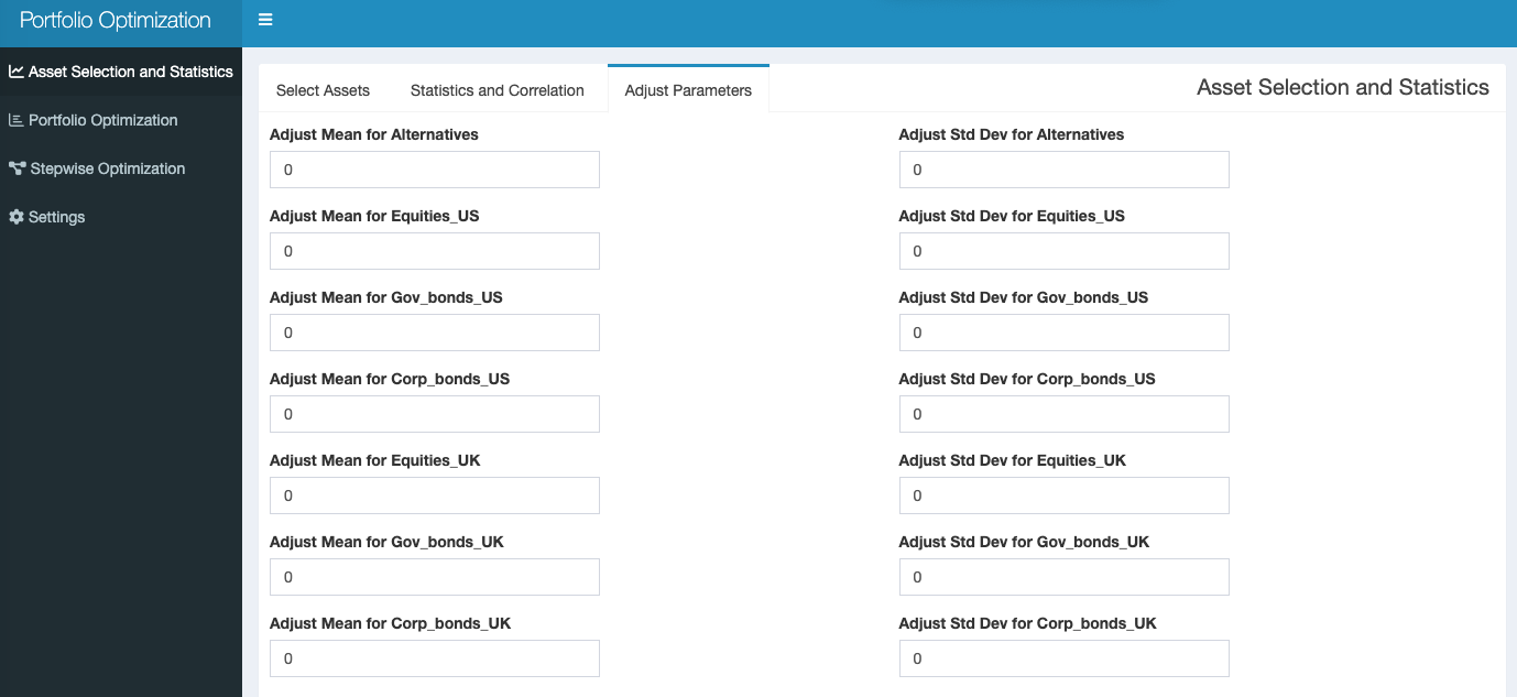 Prior to performing portfolio optimisation, there is also an opportunity to adjust some parameters, annualised mean and standard deviation, in particular, as shown below. This could be done based on market outlooks, for example.