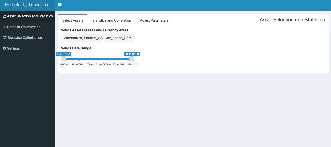 The initial Asset Selection and Statistics tab allows to select (or deselect) Asset Classes and Currency Areas as well as to choose the Date range to derive their long-term properties and covariances/correlations among them.
