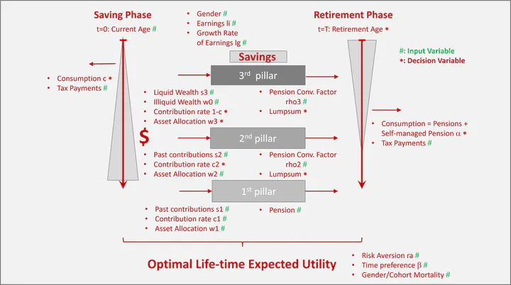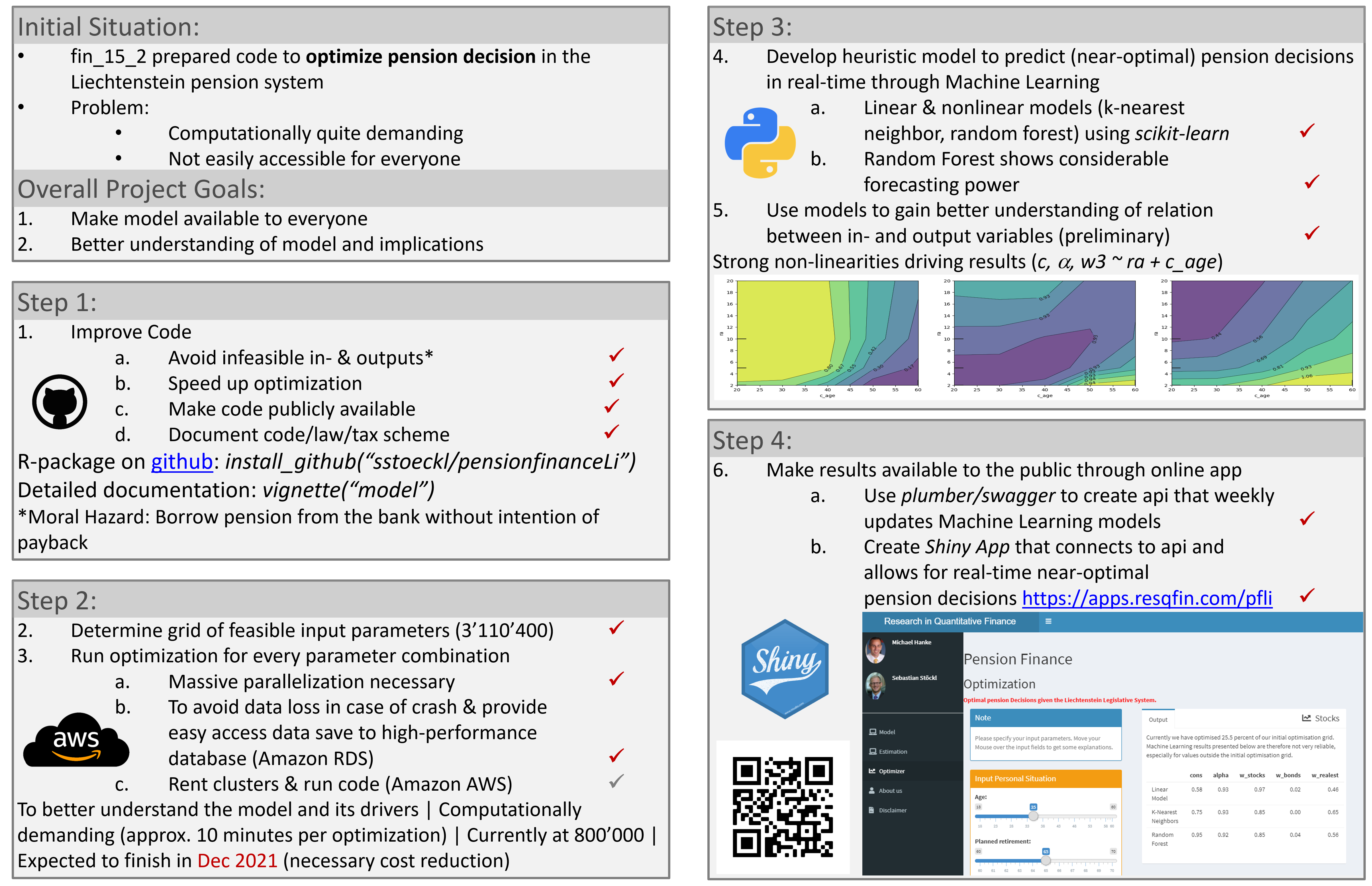 In this project we developed an R-package (available on GitHub at sstoeckl/pensionfinanceLi) to optimize decisions individuals in Liechtenstein’s pension system have to take. The package contains several optimizers as well as full documentation (available via vignette("model") once installed). We determined the most relevant drivers of optimal pension decisions using large-scale optimization, then trained three machine learning models — a hyperparameter-tuned random forest performs best — to allow individuals to receive fast, near-optimal decisions. Results are publicly available at apps.resqfin.com/pfli.