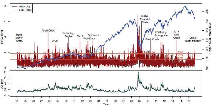 PRIX and PRIP Total Return Index (upper plot) in relation to VIX (lower plot) 1994-2015, selected market events (computed from entire dataset following Bloom, 2009).Abstract