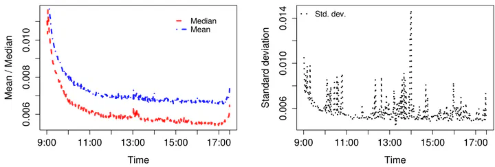 The left-hand side figure shows the cross-sectional mean and median relative bid-ask spread for each minute of a trading day. The plot on the right-hand side depicts the intra-day dynamics of the crosssectional standard deviation of the relative bid-ask spread.Abstract