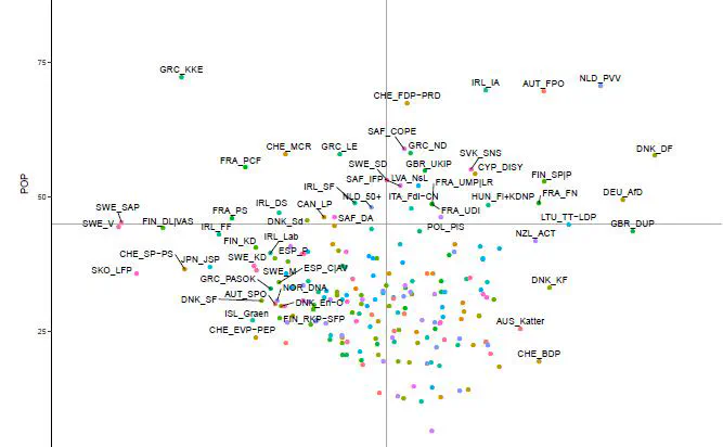 This figures plots the Populism score (POP) against the - centered - Left-Right score (PRILE) calculated according to Section 3.2 of the paper. All political information comes from the Comparative Manifesto project (CMP). We depict country-party combinations (labeled as country_party in abbreviated form) for the most recent election that we find in our election database (Table 2).Conclusion