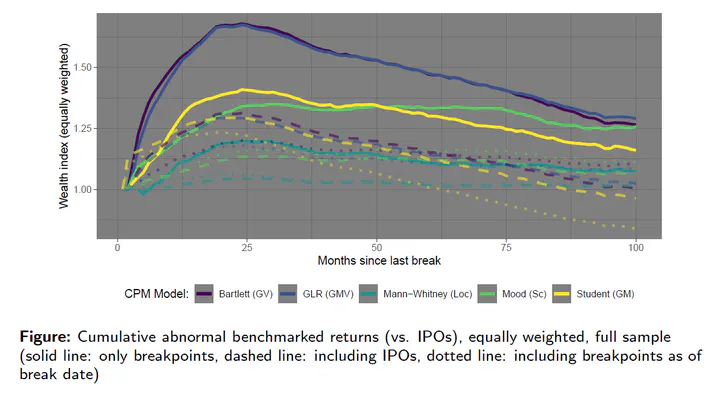 Cumulative abnormal benchmarked returns (vs. IPOs), equally weighted, full sample (solid line: only breakpoints, dashed line: including IPOs, dotted line: including breakpoints as of break date)Abstract